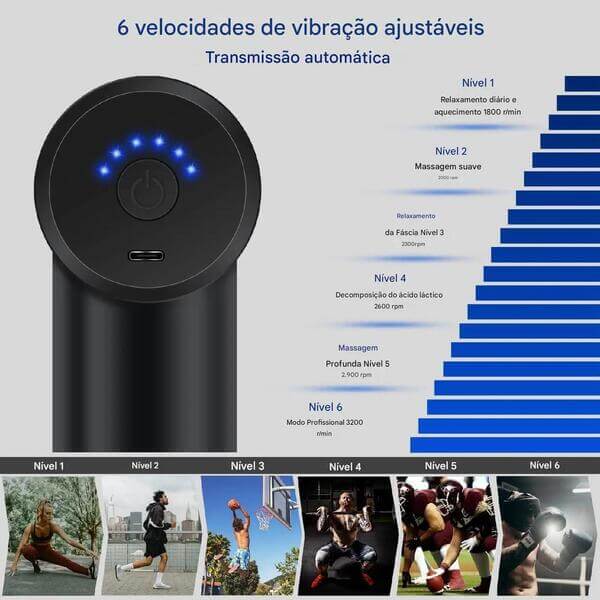 6 Velocidades Ajustáveis: Personalize a intensidade para atender suas necessidades, de relaxamento leve a massagem profunda.
